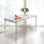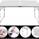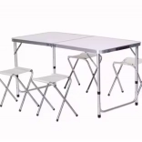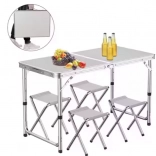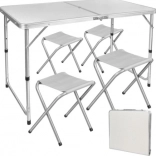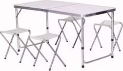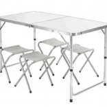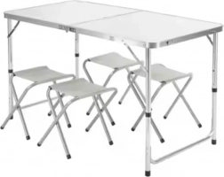 Set obsahuje ľahký a pritom pevný stôl a štyri pohodlné stoličky, vhodné na použitie na tábore, na chate, v záhrade, na balkóne či terase. Moderný dizajn s bielou doskou a strieborným hliníkovým rámom sa výborne hodí do akéhokoľvek prostredia, od prírody po organizovaný priestor domova. Set nie je len jednoduchším riešením pre organizáciu vonkajšieho odpočinku, ale tiež šetrí miesto – po zložení sa dá ľahko uložiť do skrine, garáže alebo pod posteľ.