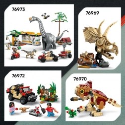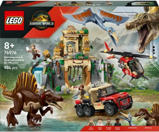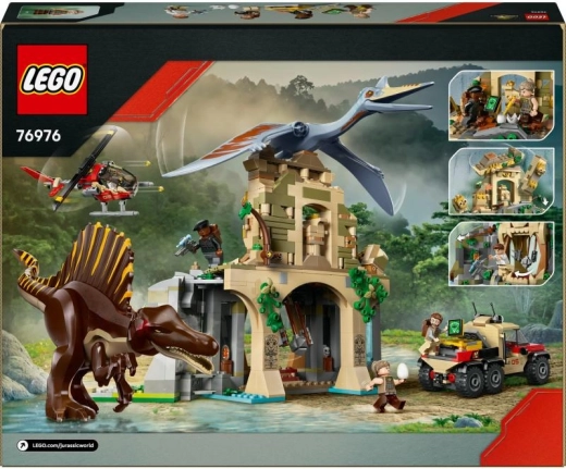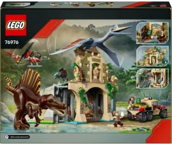Objavte filmom inšpirovanú akciu v džungli: staroveký chrám s vodopádom ukrýva hniezdo s vajíčkami, tajné priechody a pascu so spúšťacou reťazou. Pohyblivý Spinosaurus (nohy, laby, chvost, hlava a čeľusť) a majestátny Quetzalcoatlus (krídla a čeľusť) pridávajú realistické scény prenasledovania aj záchrany.