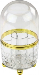 Elegantný organizér s priehľadným krytom je štýlové riešenie pre každú toaletku, písací stôl alebo poličku v kúpeľni. Vyniká funkciou otočenia o 360°, ktorá umožňuje rýchle otočenie nádoby pre nájdenie správnej priehradky. Priehľadný kryt chráni kozmetiku a štetce pred prachom a znečistením.