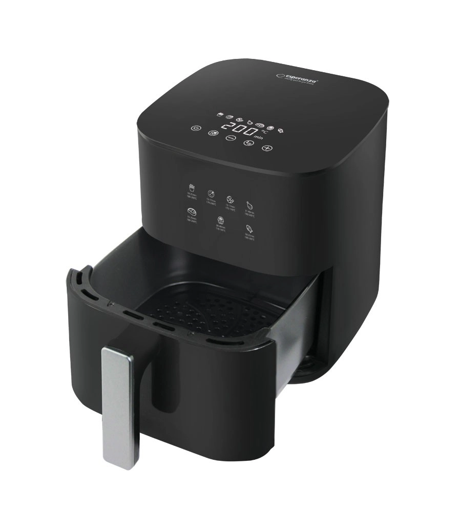 Teplovzdušná fritéza Esperanza PATATE FRITTE je perfektnou voľbou pre tých, ktorí si chcú užiť chuť vyprážaných jedál v zdravšej verzii. Umožňuje prípravu chrumkavých hranolčekov a šťavnatého kurčaťa bez použitia oleja, jednoducho a chutne.