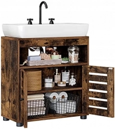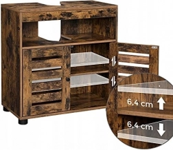 Vytvorte estetický a funkčný priestor vo vašej kúpeľni s touto rustikálnou skrinkou pod umývadlo. Jej kompaktný, ale priestranný dizajn pomáha organizovať uteráky, kozmetiku a hygienické produkty, zatiaľ čo zároveň zachováva elegantný vzhľad. Vyrobené z odolnej drevotriesky v trendovom rustikálnom hnedom prevedení, dodáva každej miestnosti teplo a charakter.