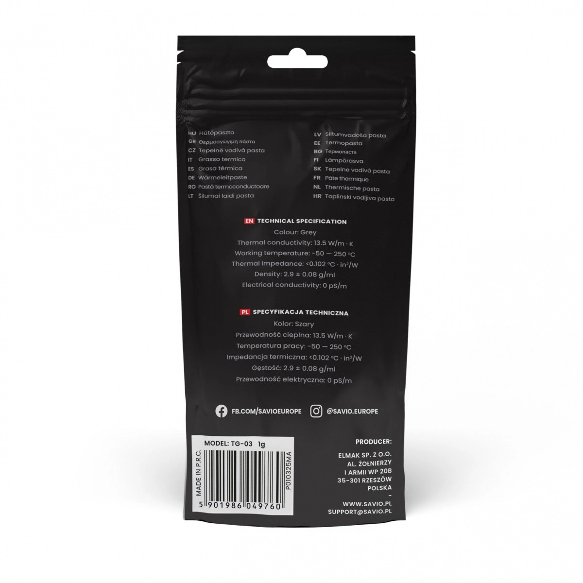 Savio TG-03 je k dispozícii v baleniach s hmotnosťou 1g, 2g a 4g s ochranným balením proti vysychaniu.