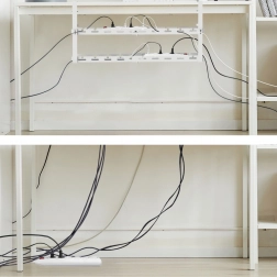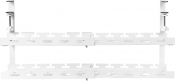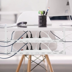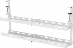 Organizér pod stolík má dve úrovne držiakov, ktoré umožňujú súčasné upevnenie dvoch napájacích líšt alebo dodatočných zariadení, ako sú adaptéry, USB huby alebo routery. Svorkový montážny systém umožňuje rýchlu a neinvazívnu inštaláciu bez potreby vŕtania alebo narušenia povrchu nábytku.