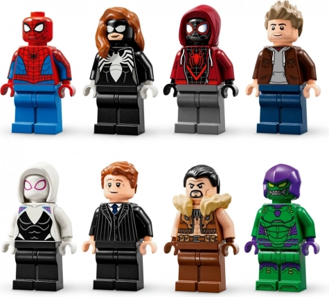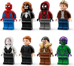 V balení nájdete 8 zberateľských minifigúrok – Spider-Man, Spider-Woman, Miles Morales (s motocyklom), Eddie Brock, Ghost-Spider, Norman Osborn, Kraven lovec a Zelený goblin (s klzákom). Vďaka modulárnemu riešeniu set ľahko prestaviate a vytvoríte si vlastné akčné ulice na hranie aj vystavenie.