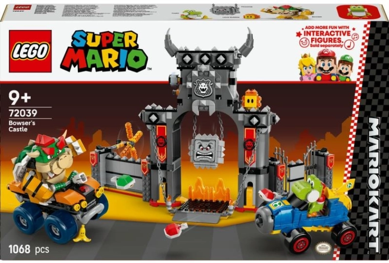 Vstúpte do sveta pretekov a súbojov v legendárnom Bowserovom hrade. Tento veľký set s 1068 dielikmi prináša bohaté herné prvky: skladacie hradné steny, rotujúci Fire Bar, padajúceho Thwompa na reťazi a interaktívne prekážky s lávou. Nechýbajú štyri zberateľské figúrky – Bowser, Yoshi, Thwomp a Lava Bubble – a tiež projektily škrupín a banán pre napínavé súboje na trati.