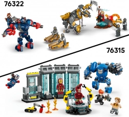 Zažite epickú bitku dobra a zla s ikonickými hrdinami z univerza MARVEL. Set prináša realistickú akciu: zelený Hammerov dron s pružinovým vystreľovačom, modrý dron s dvojitými vystreľovačmi, minifigúrku IRON MAN s modrými blastermi a minifigúrku WAR MACHINE s červenými blastermi a ramenným miotáčom kociek.