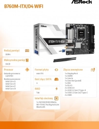 ASRock B760M-ITX/D4 WiFi je výkonná mini‑ITX doska na stavbu kompaktných PC. Podporuje moderné procesory Intel Core (LGA1700), rýchle pamäte DDR4 až 5333+ (OC), grafické karty cez PCIe 4.0 x16 a rýchle úložiská vďaka Hyper M.2 (PCIe Gen4 x4). Stabilné napájanie zabezpečuje 5+1+1 VRM s Dr.MOS, zosilnené 6‑vrstvové PCB a oceľový PCIe slot.