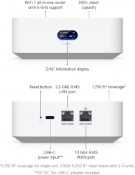Na zadnej strane nájdete vysokorýchlostné porty vrátane 2.5G a 10G Ethernetu pre gigabitové až multigigabitové pripojenie, rovnako ako USB‑C na napájanie alebo servis. Predný displej zobrazuje v reálnom čase kľúčové metriky siete (klienti, priepustnosť), čo zjednodušuje monitoring a správu.