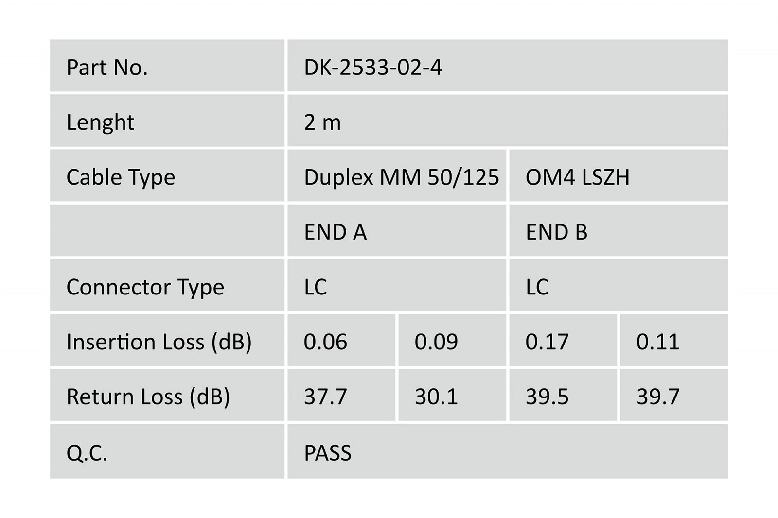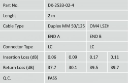 Konektory LC s keramickými ferulami zaručujú stabilné spojenie s nízkym útlmom. Plášť LSOH minimalizuje dymivosť a neobsahuje halogény, čo je vhodné pre inštalácie v interiéroch s dôrazom na bezpečnosť. Kábel je dodávaný samostatne balený s protokolom merania pre istotu zhody a kvality.