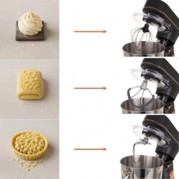 - Bohaté príslušenstvo: hák na cesto, metla, šľahací balón, veko, stierka, separátor vajec, cukrársky rukáv s 24 nadstavcami v organizéri.