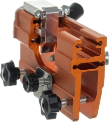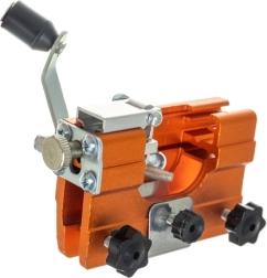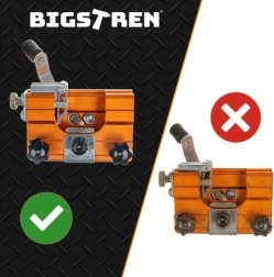 Inštalácia prebieha priamo na lištu – bez demontáže reťaze. Robustné upnutie a ergonomická kľučka minimalizujú vibrácie a riziko podkĺznutia. Odolná konštrukcia z anodizovaného hliníka s oceľovým spojovacím materiálom je pripravená na náročné použitie v dielni aj v lese.