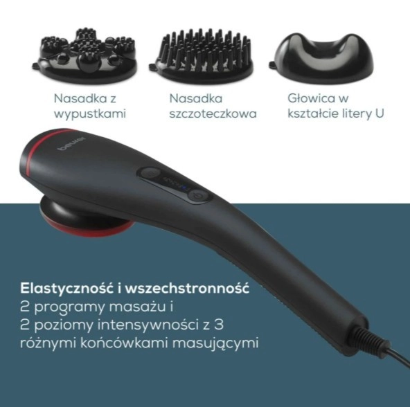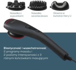 Pre prispôsobenie masáže vašim potrebám sú k dispozícii 3 vymeniteľné nadstavce, 2 programy masáže a 2 stupne intenzity. O aktuálnom nastavení vás prehľadne informuje farebná LED kontrolka, zatiaľ čo protišmyková rukoväť zabezpečuje bezpečný úchop počas používania.