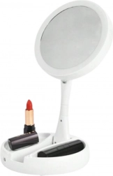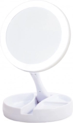Elegantné stolové zrkadlo s LED podsvietením a obojstrannou plochou (1× a 10× zväčšenie) je ideálne na make‑up, starostlivosť o pleť aj nasadzovanie šošoviek. Vďaka otočnej konštrukcii 180° ľahko prepnete stranu, zatiaľ čo praktický organizér v základni udrží kozmetiku poruke. Napájanie zaistí 4× AA batérie alebo kábel MicroUSB pre maximálne pohodlie.