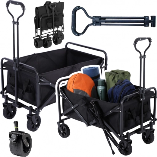 Praktický skladací vozík s kapacitou 120 l a nosnosťou až 80 kg je ideálny na pláž, do kempu aj do záhrady. Vďaka robustnej kovovej konštrukcii, štyrom kolesám a teleskopickej rukoväti s penovým úchopom umožňuje ľahký transport výbavy, nákupov aj náradia. Rýchle zloženie šetrí miesto a dve vrecká na nápoje pridávajú pohodlie na cestách.