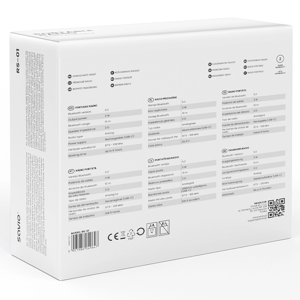Kompaktné a ľahké prenosné rádio SAVIO RS‑101 prináša čistý a vyvážený zvuk doma aj na cestách. Vďaka FM rádiu, Bluetooth 5.3, AUX vstupu a nabíjaniu cez USB‑C si ľahko prehráte obľúbené stanice aj hudbu z telefónu. Vysúvacia anténa zabezpečuje stabilný príjem a vstavaný akumulátor ponúka až 6 hodín počúvania v elegantnom retro dizajne.