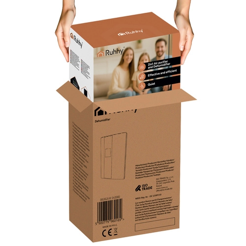 RUHHY kombinuje odvlhčovanie a čistenie vzduchu v jednom kompaktnom zariadení, ktoré spoľahlivo pracuje v miestnostiach až do 30 m². Vďaka Peltierovmu modulu je energeticky úsporný (90 W) a veľmi tichý, takže neruší ani v noci – pomôže v spálni aj detskej izbe. UV režim Air Purify prispieva k sviežemu prostrediu, zatiaľ čo automatické odmrazovanie Defrost zabezpečuje bezproblémovú prevádzku aj pri nižších teplotách.