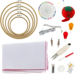 Sada je ideálna ako darček aj na vybavenie domácej dielne. Praktická taška na uloženie udrží všetko na svojom mieste a rôzne veľkosti bambusových tamborkov uľahčia prácu na menších aj väčších motívoch.