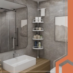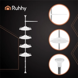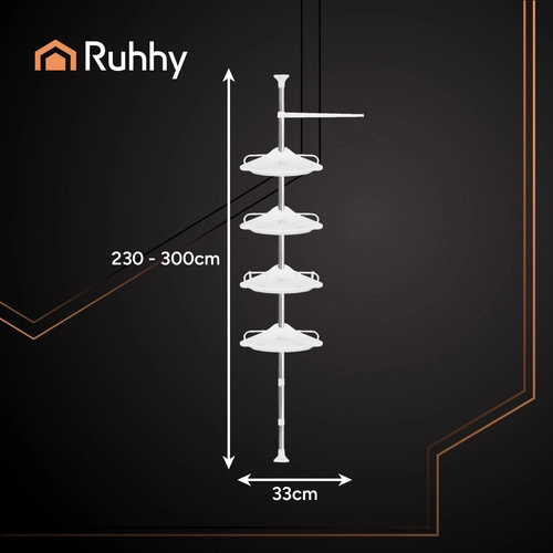 Udržujte kúpeľňu dokonale prehľadnú s rohovou teleskopickou sprchovou policou RUHHY. Nastaviteľná výška 240–310 cm sa prispôsobí väčšine kúpeľní bez vŕtania. Štyri úrovne políc, háčiky a držiak na uterák pohodlne pojmú kozmetiku aj kúpeľňové doplnky. Protišmykové koncovky zaistia stabilitu a rýchla montáž znamená poriadok a štýl behom pár minút.