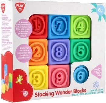 Reliéfne čísla na každej kocke podporujú rané počítanie a rozpoznávanie čísel. Deti môžu stavať veže v číselnom poradí a učiť sa hrou.