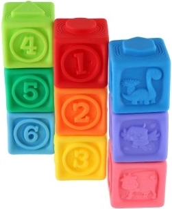 farebné kocky s reliéfnymi číslami, tvarmi a zvieratkami
