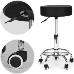 Odolné spracovanie a jednoduchá údržba – čalúnenie z PVC kože je nenáročné na čistenie a odoláva vode, masážnym olejom aj dezinfekcii. Kovová (chrómovaná) konštrukcia so širokou päťramennou základňou na kolieskach zaručuje stabilitu a hladký pohyb po väčšine podláh bez poškriabania.