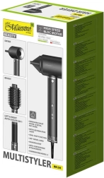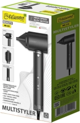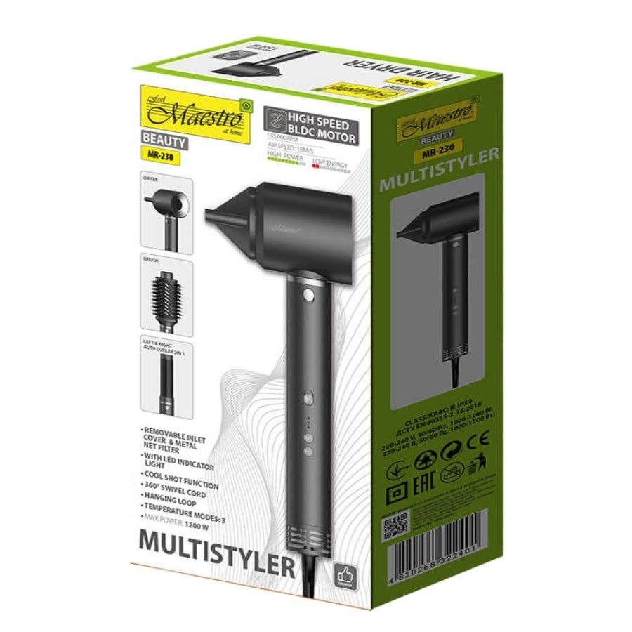 Univerzálny multistyler MAESTRO MR-230 kombinuje 3 zariadenia v 1 – výkonný fén, tvarovací horúcevzdušný kefa a automatickú kulmu 2v1. S výkonom 1200 W, prúdom vzduchu 18 m/s a magnetickými nadstavcami zabezpečí rýchle sušenie, objem aj prirodzené vlny. Nechýba BLDC motor 110 000 ot./min, 2 stupne teploty, studený vzduch a otáčavý kábel 360° pre pohodlné použitie.