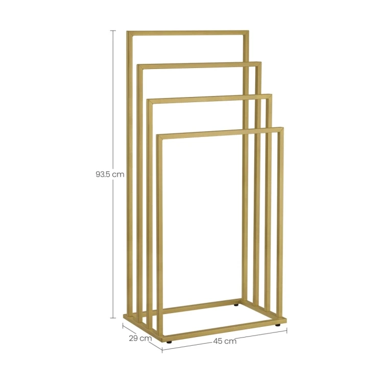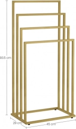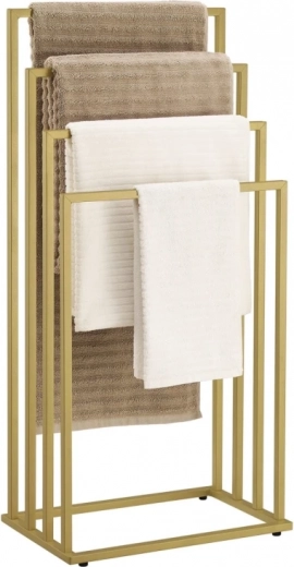 Vneste do kúpeľne poriadok a štýl. Štyri stupňovito usporiadané ramená umožňujú cirkuláciu vzduchu pre rýchlejšie schnutie uterákov, županov aj plaviek. Minimalistický rám v matnej zlatej farbe sa hodí do moderných aj klasických interiérov a šetrí miesto vďaka vertikálnemu riešeniu.