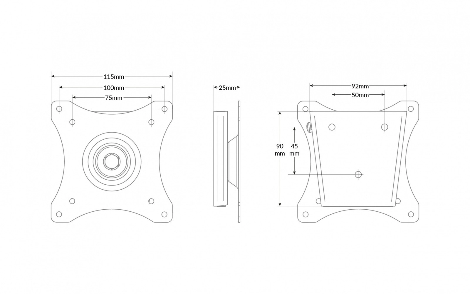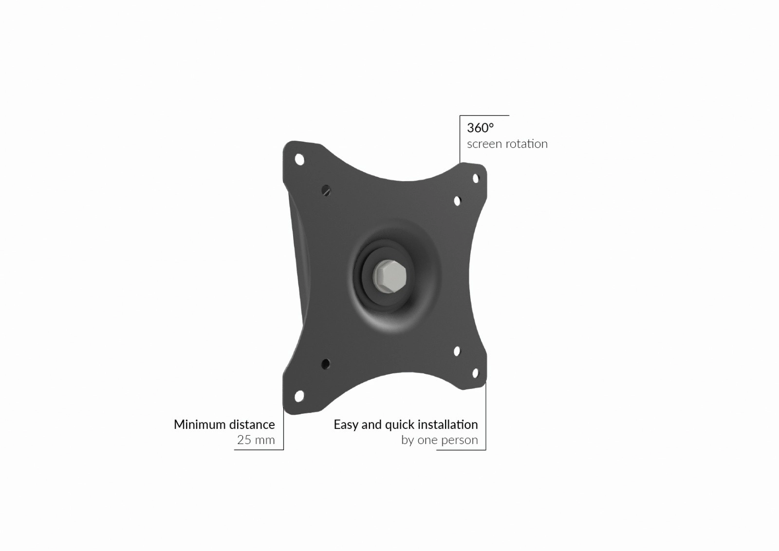 Univerzálny nástenný držiak pre malé obrazovky s VESA 75x75 a 100x100 ponúka otočenie o 360°, minimálnu vzdialenosť od steny 25 mm a bezpečné istenie proti sňatiu. Vďaka jednoduchej konštrukcii zabezpečuje rýchlu a jednoduchú montáž jednou osobou a moderný vzhľad, ktorý sa hodí do hotelových izieb, čakární aj domácností.