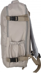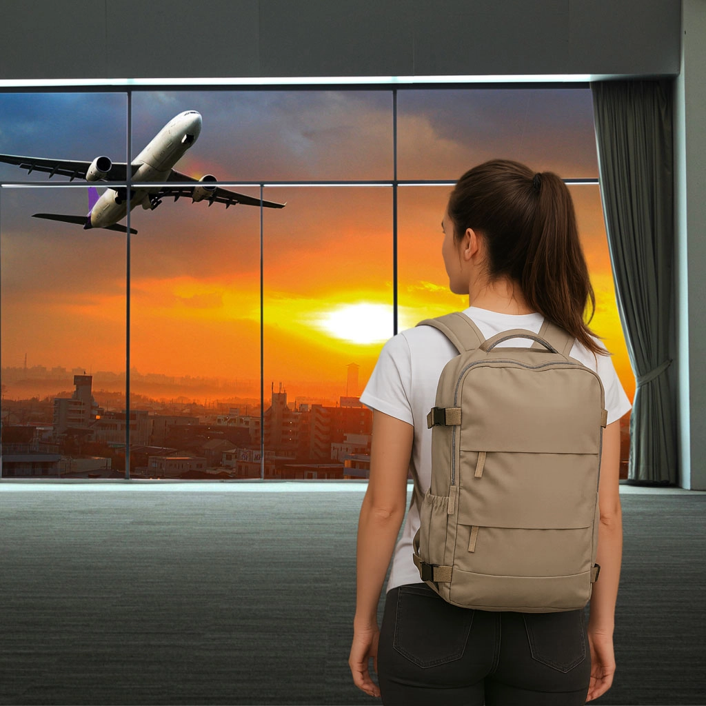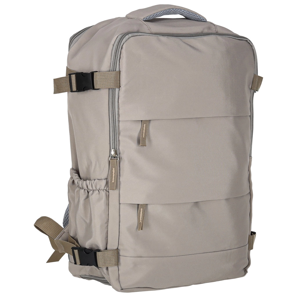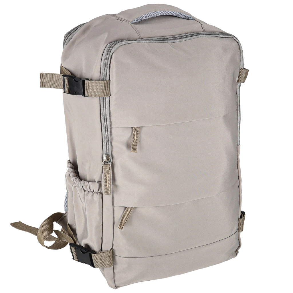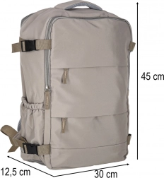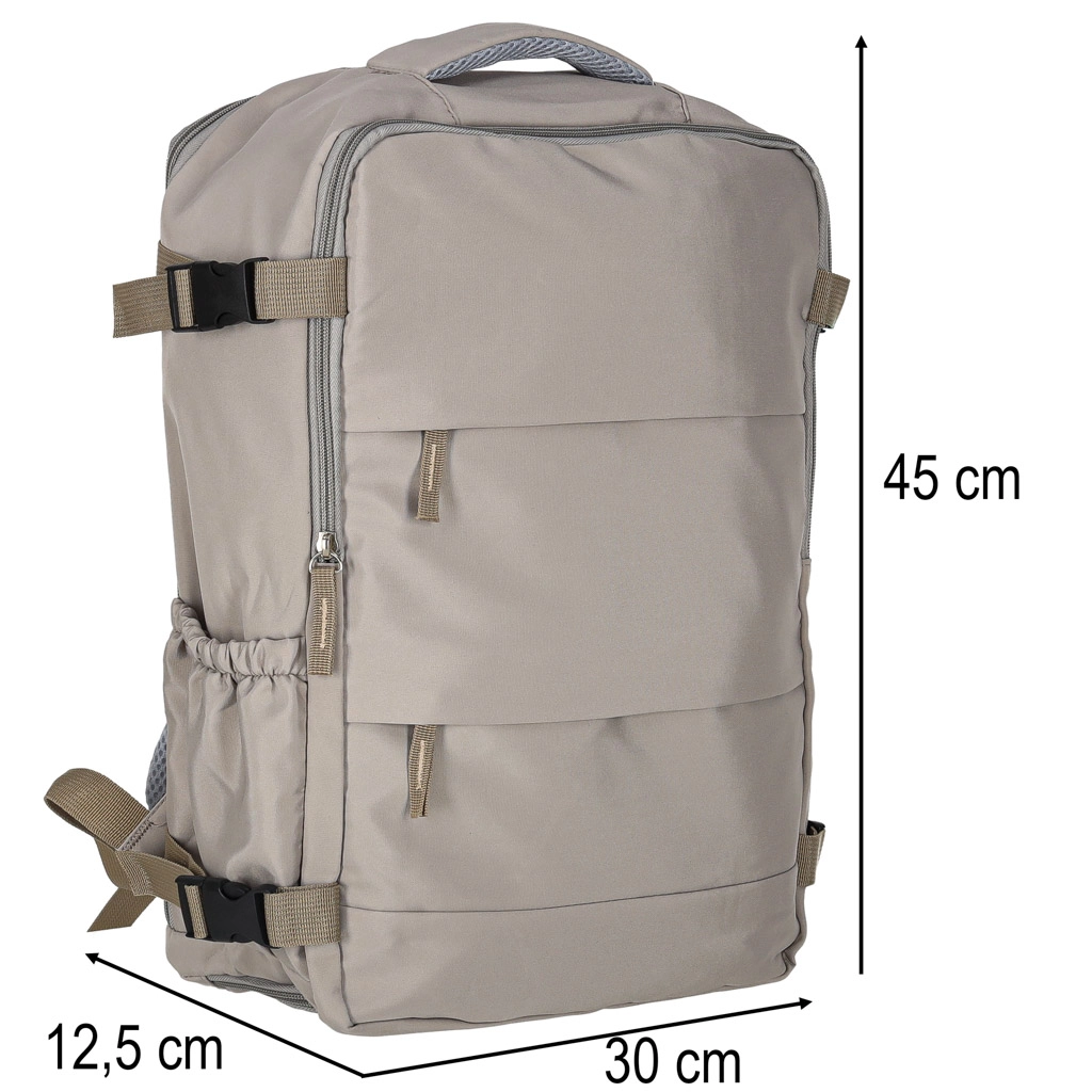 Štyri kompresné popruhy zmenšia objem a zafixujú obsah, takže batoh drží tvar aj pri čiastočnom naplnení. Dve predné vrecká na zips a dve elastické bočné vrecká sú ideálne na fľašu alebo dáždnik. Kompaktné rozmery 45 × 30 cm spĺňajú požiadavky mnohých aerolínií na príručnú batožinu.