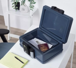 Schránka poskytuje až 30 minút certifikovanej ochrany proti ohňu a 72 hodín vodotesnej ochrany pri záplavách alebo úniku vody. Integrované transportné madlo uľahčuje prenášanie a praktický formát sa zmestí do skrine, zásuvky aj na policu.
