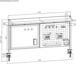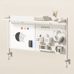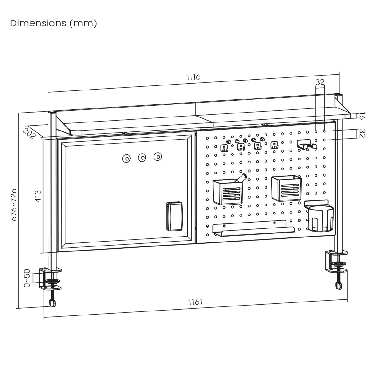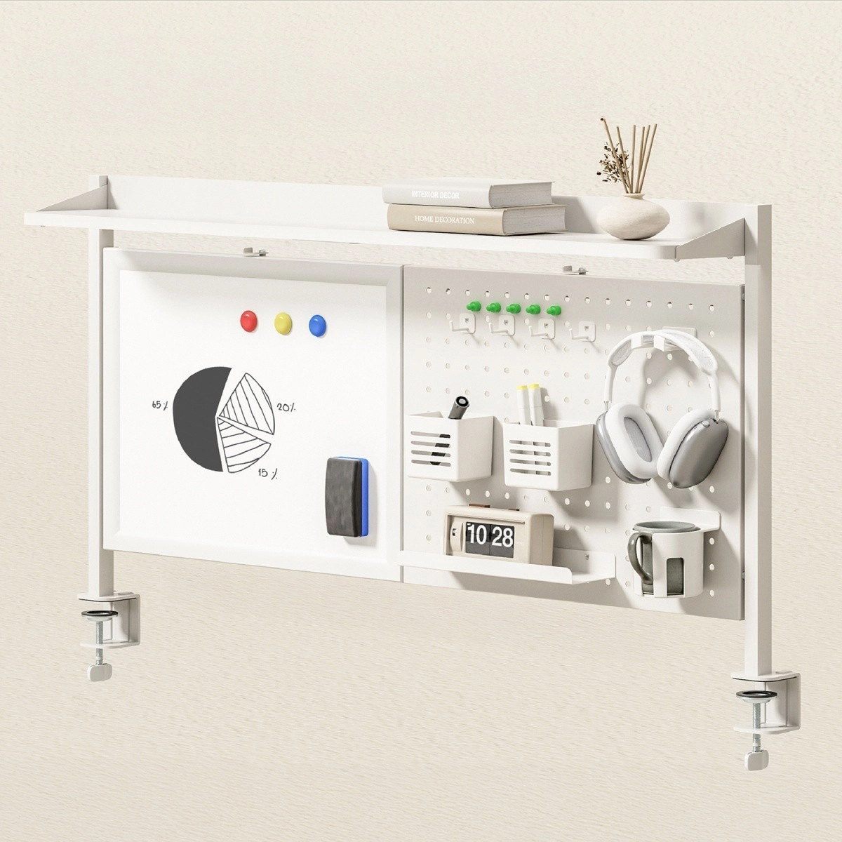 Kompaktná priečka na stôl ER-301 premení pracovnú plochu na prehľadné a efektívne miesto. Montáž pomocou pevných kovových svoriek bez vŕtania, magnetická sucho stierateľná tabuľa na rýchle poznámky a perforovaný panel na voliteľné rozmiestnenie príslušenstva. Súčasťou sú háčiky, kovové tégliky, polička, držiak na pohár a magnety – všetko pre maximálny poriadok a úsporu miesta.