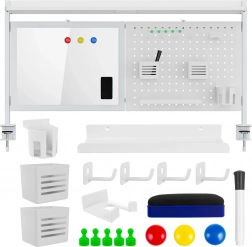 Stredom zostavy je magnetická sucho stierateľná tabuľa na písanie a magnety a vedľa nej kovová dierovaná (pegboard) tabuľa na flexibilné zavesenie doplnkov. V balení nájdete všetko potrebné na okamžité použitie: háčiky, tégliky na ceruzky, držiak na hrnček, poličku a sadu magnetov a pripináčikov.