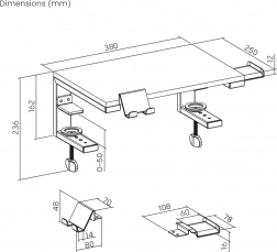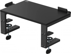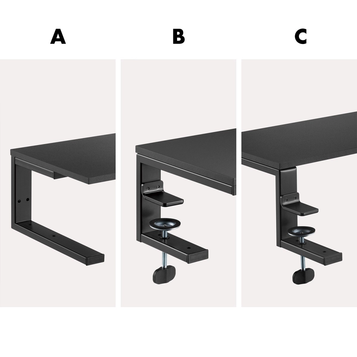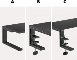 Inštalácia je rýchla a bez poškodenia nábytku – dvojica nastaviteľných svoriek sa pevne uchytí k doske stola (max. hrúbka cca 50 mm), zatiaľ čo gumové podložky chránia povrch pred poškrabaním. Robustná konštrukcia zaisťuje vysokú stabilitu aj pre ťažšie zariadenia až do 20 kg.