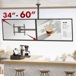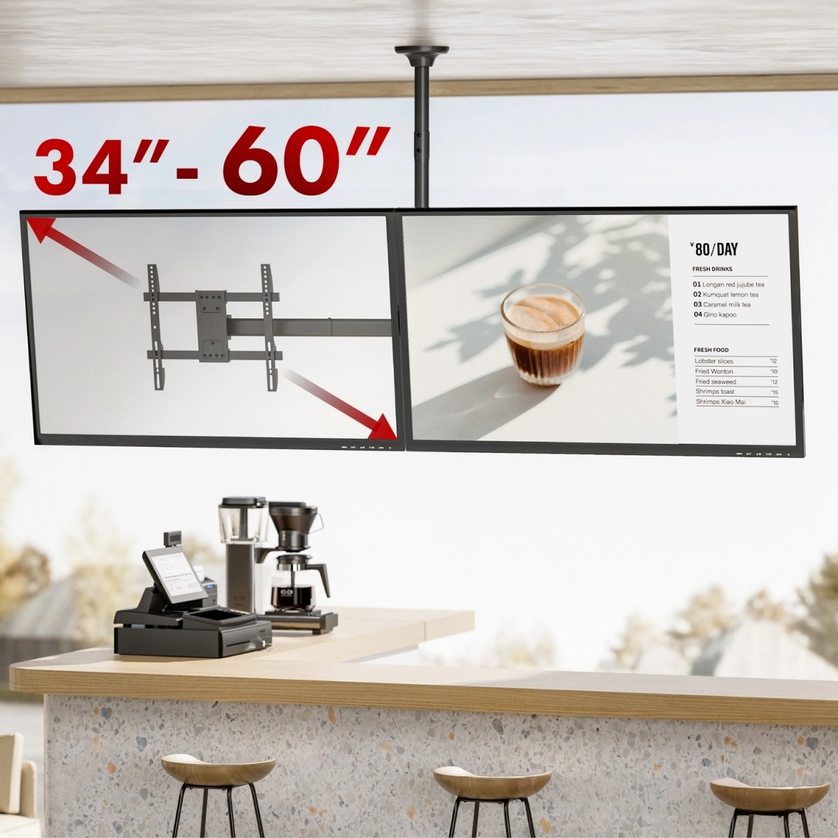 Profesionálny stropný držiak pre dva TV je ideálny do kancelárií, obchodov, recepcií, fitness centier aj domácností, kde je potrebná úspora miesta a perfektná viditeľnosť. Robustná oceľová konštrukcia zaisťuje stabilitu, zatiaľ čo presné nastavenie polohy umožňuje pohodlné sledovanie z akéhokoľvek uhla.