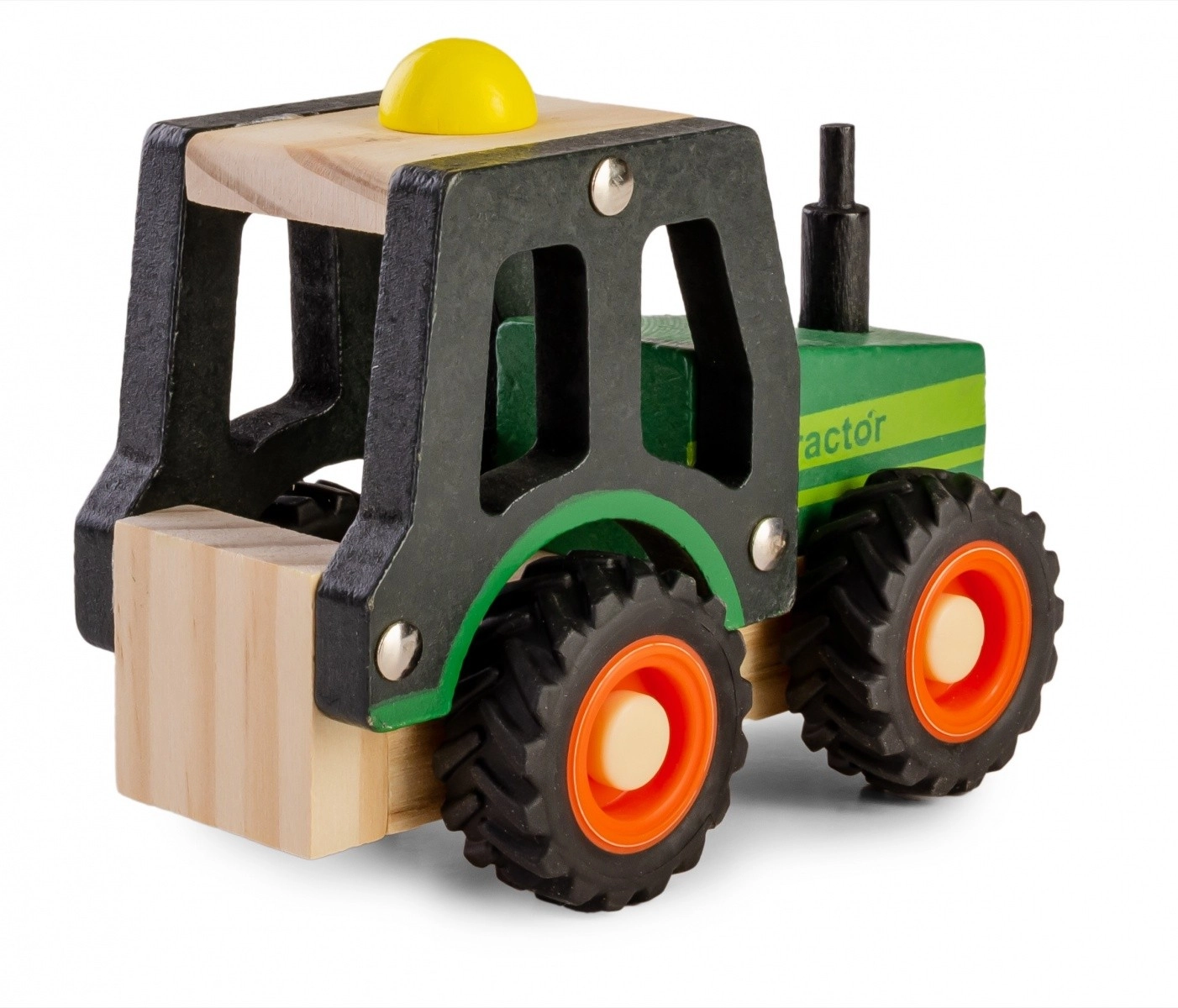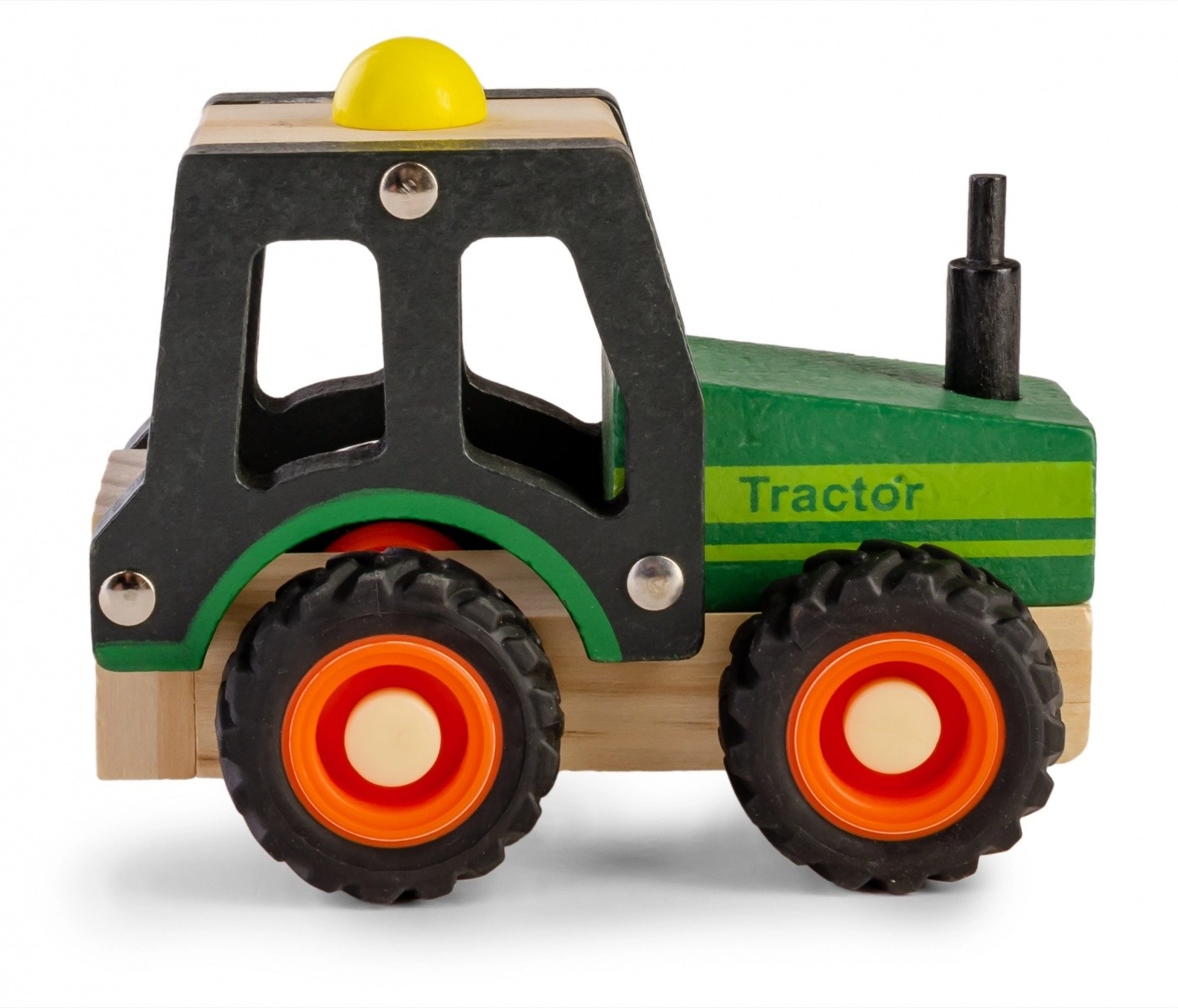 Drevený traktor je skvelou voľbou pre prvé vozidlá do detskej izby. Vďaka robustnému spracovaniu a zaobleným tvarom je bezpečný, príjemný na dotyk a pripravený na každodenné hranie. Mäkké gumové pneumatiky zabezpečujú dobrú priľnavosť a tichý pohyb po podlahe.