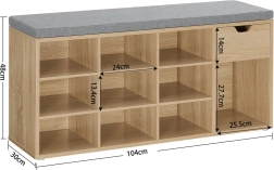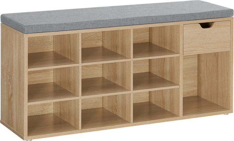 Na hornej doske je mäkký sivý sedák s hrúbkou cca 4,5 cm, ktorý je k telu skrinky prichytený na suchý zips – ľahko ho tak zložíte a vyčistíte. Vo vnútri nájdete 10 hlbokých políc na obuv až do cca veľkosti 44 a praktický priestor na drobnosti. Každá polica unesie až 10 kg, celková nosnosť skrinky je 200 kg.