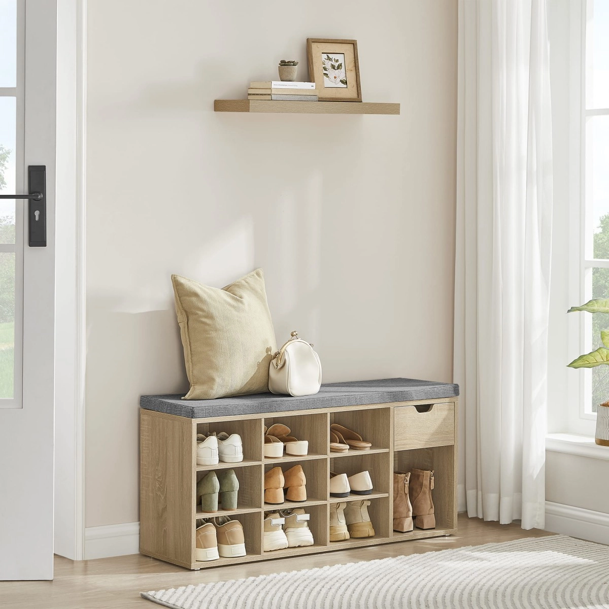 Urobte poriadok v predsieni, chodbe alebo šatníku. Tento botník kombinuje úložný priestor a pohodlné sedenie, takže si topánky obujete aj vyzujete v pokoji a bez hľadania. Vďaka univerzálnej farbe sonoma a čistým líniám sa hodí do moderných aj klasických interiérov.