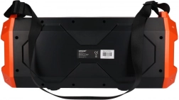 Praktický bočný panel s prehľadným displejom zabezpečuje jednoduché ovládanie. Vstavaná batéria 2000 mAh poskytne až 5 hodín prehrávania a plne sa dobije približne za 3 hodiny. Súčasťou je ramenný popruh pre pohodlné nosenie. Odolné čierne prevedenie s oranžovými akcentmi pôsobí štýlovo a moderne.