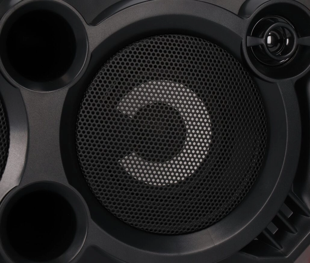 Vďaka konštrukcii Bass reflex a hudobnému výkonu až 100 W (3 200 W P.M.P.O.) hrá nahlas, plno a s dôrazom na basy. Ekvalizér umožní upraviť výšky a basy, takže si zvuk doladíte podľa seba. Funkcia karaoke so 6,5 mm mikrofónovým vstupom a samostatným ovládaním echo efektu rozprúdi každú párty, ktorú podčiarkne multifarebné LED podsvietenie.