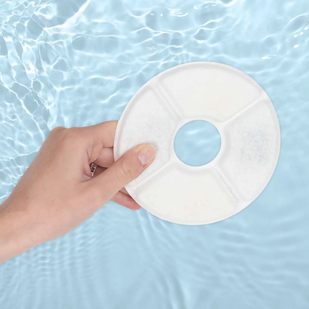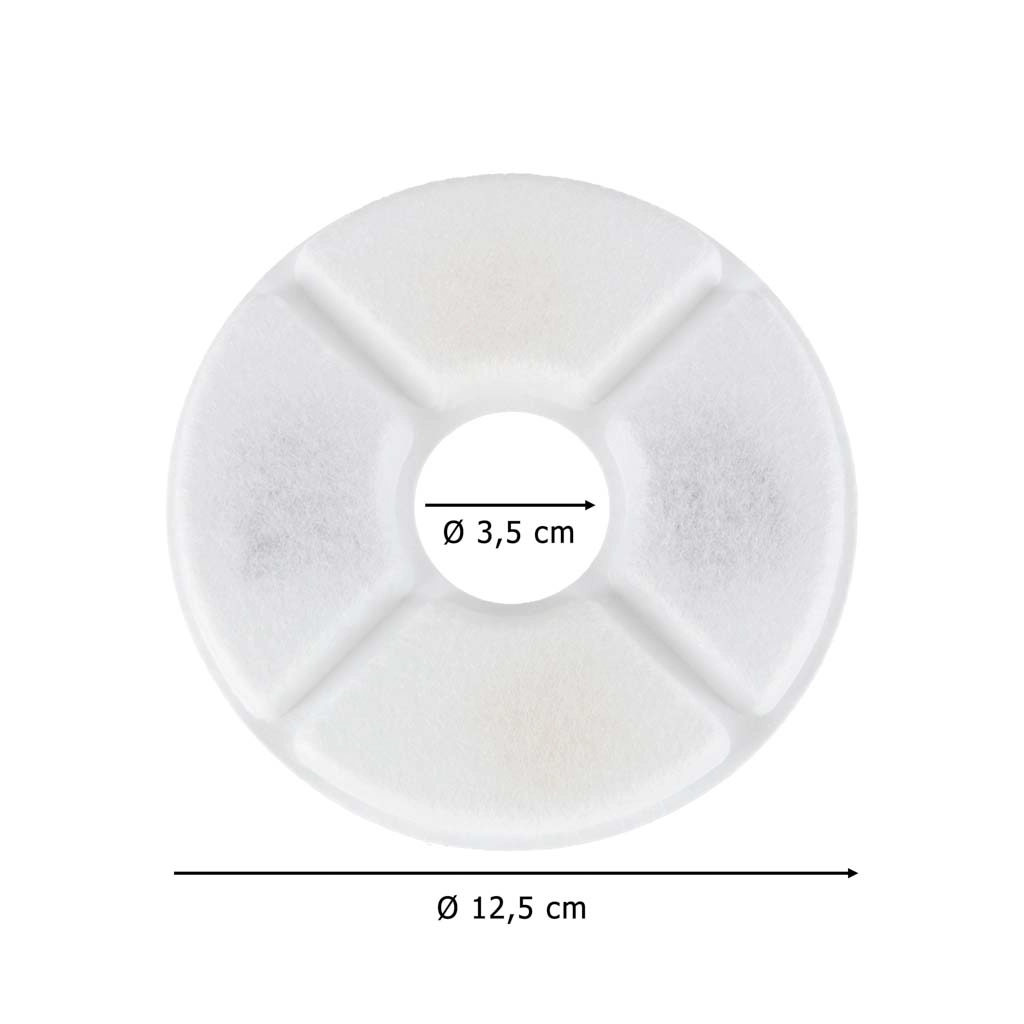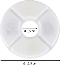 Filtre majú priemer 12,5 cm a stredový otvor 3,5 cm, takže ľahko sadnú do väčšiny okrúhlych fontánok s centrálnym stĺpikom. Inštalácia je rýchla a bez náradia – stačí vložiť, prepláchnuť a používať.
