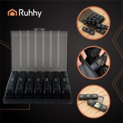 Praktický týždenný organizér na lieky RUHHY pomôže udržať poriadok a pravidelnosť dávkovania počas celého týždňa. Obsahuje 7 vyberateľných boxov s jasným označením dní a rozdelením na ráno, poludnie a večer. Vďaka pevnému puzdru je kompaktný, bezpečný a ideálny do domu, práce aj na cesty.