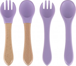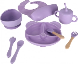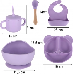 Kompletná silikónová jedálenská sada pre deti v elegantnej fialovej farbe uľahčí prvé kroky k samostatnému stolovaniu. Obsahuje všetko potrebné: delený tanier s prísavkou, miska s prísavkou, učíci hrnček s viečkom a slamkou, 2 lyžičky a 2 vidličky a nastaviteľný podbradník s vreckom. Vyrobené z bezpečného silikónu bez BPA, vhodné do umývačky riadu aj mikrovlnnej rúry.