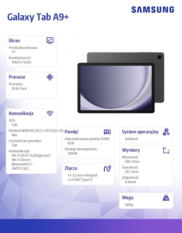 Štýlový tablet Samsung Galaxy Tab A9+ ponúka veľký displej na zábavu aj prácu, rýchle Wi‑Fi pripojenie, solídny výkon a 128 GB úložisko v tenkom a ľahkom tele. Ideálny na filmy, hry, prehliadanie webu aj učenie na cestách.