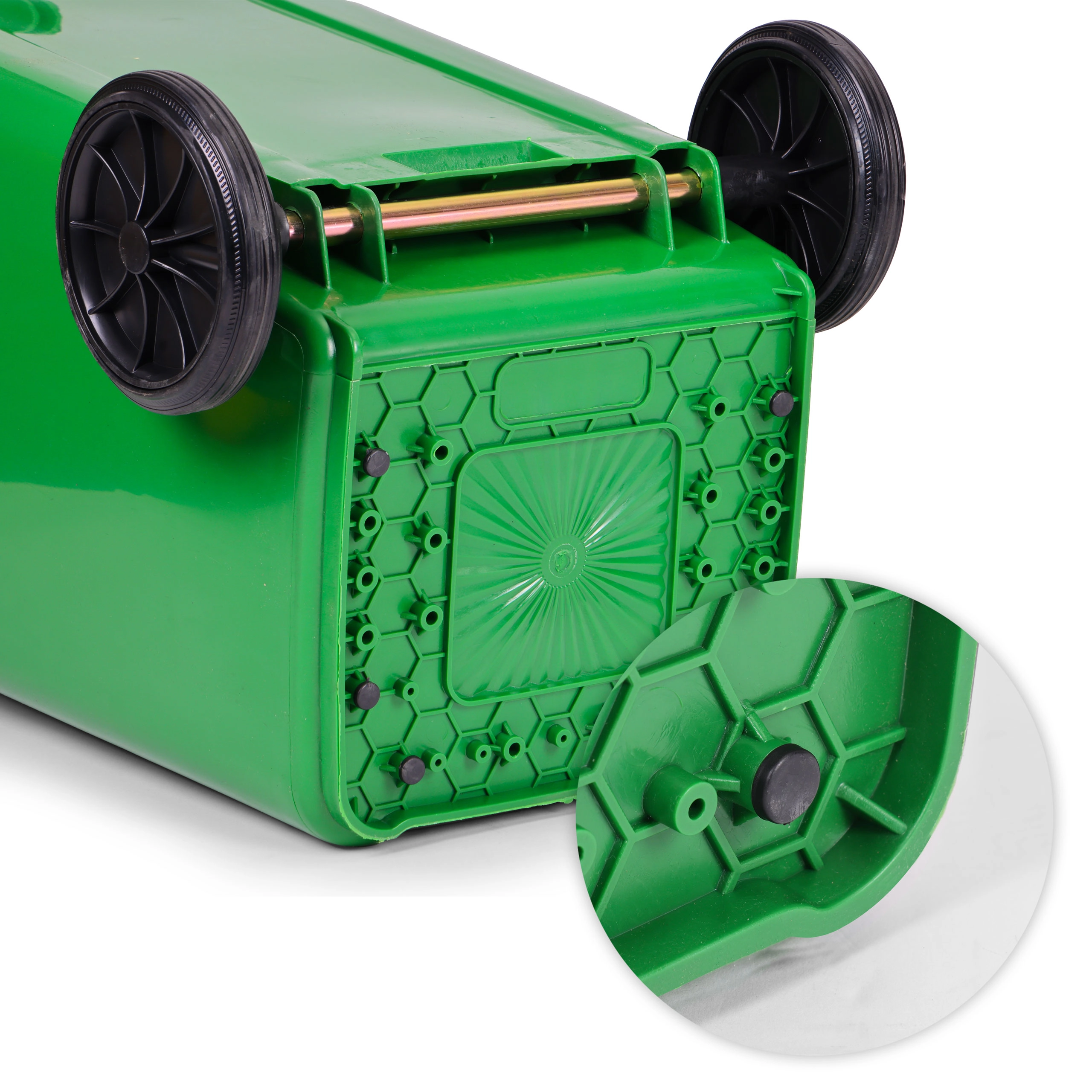 Na pohodlné premiestňovanie slúžia gumové kolesá na kovovej osi a ergonomické madlá s protišmykovým profilom. Stabilizačné nožičky obmedzujú posun po mokrom povrchu a chránia podlahu pred poškrabaním. Nádoba je plne kompatibilná s komunálnymi vozidlami podľa EN 840 a vďaka normám ISO9001, ISO14001, ISO45001 spĺňa náročné požiadavky na kvalitu a bezpečnosť.