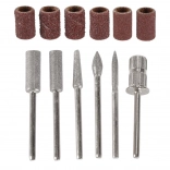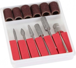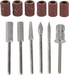 - Bohatá výbava: 6 kovových fréz (špicatá, valcová, kužeľová, guľôčková, ihlová, tŕň pre brúsne krúžky) + 6 brúsnych návlekov rôznej zrnitosti.