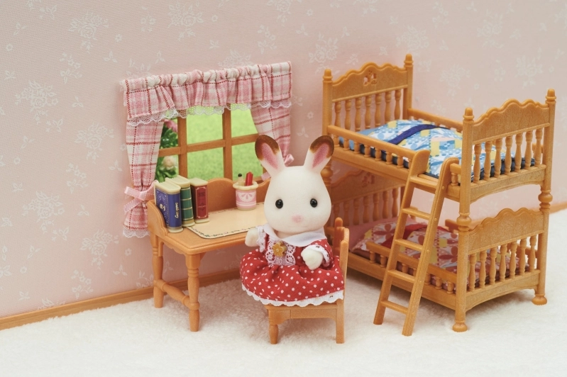 Vytvorte útulný kútik na učenie aj oddych s vidieckou detskou izbou SYLVANIAN FAMILIES. Poschodová posteľ pohodlne ubytuje dve figúrky a vďaka rebríku a mäkkým lôžkovinám pôsobí realisticky. Písací stôl so stoličkou a bohatou sadou doplnkov, ako sú knihy, hodiny a glóbus, pozýva k hraniu scén z každodenného života.