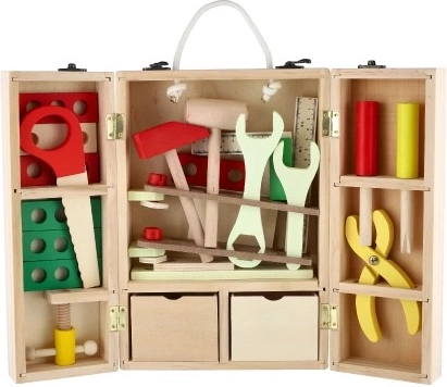 Štýlový drevený kufrík plný hračkárskeho náradia pre malých majstrov. Obsahuje všetko potrebné na hru na opravára a staviteľa – od skrutkovačov a kľúčov po pílku a pravítko. Hračka podporuje jemnú motoriku, technické myslenie a kreatívnu hru. Ideálny darček pre deti od 3 rokov.