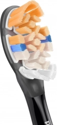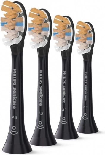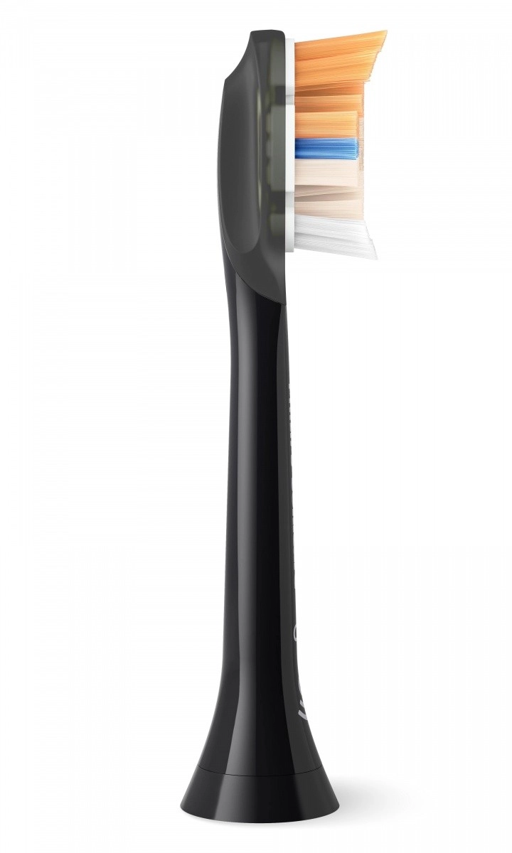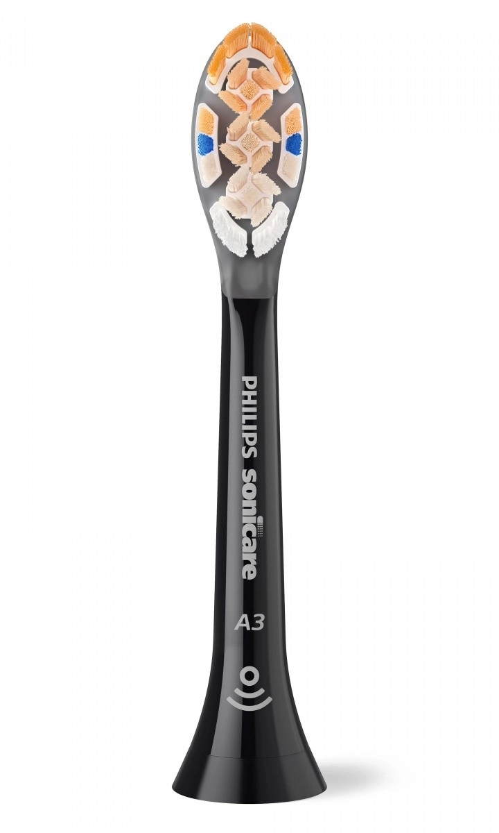 Hlavice Sonicare A3 All‑in‑One spájajú špičkovú sonickú technológiu a premyslený tvar vlákien pre hĺbkové čistenie aj na ťažko dostupných miestach. Trojuholníkové a viacfarebné zóny vlákien zvyšujú styčnú plochu a efektívnejšie odstraňujú pigmentácie a nánosy, zatiaľ čo extra dlhé bočné vlákna sa starajú o líniu ďasien.
