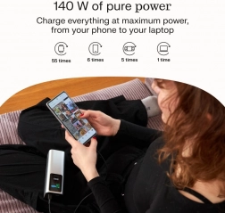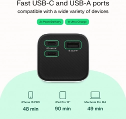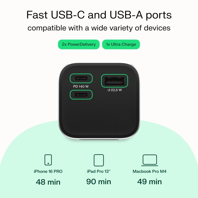 Výstupný výkon až 140 W s Power Delivery zvládne rýchlo dobiť kompatibilné ultrabooky aj náročnejšie zariadenia, a to pokojne aj súčasne.