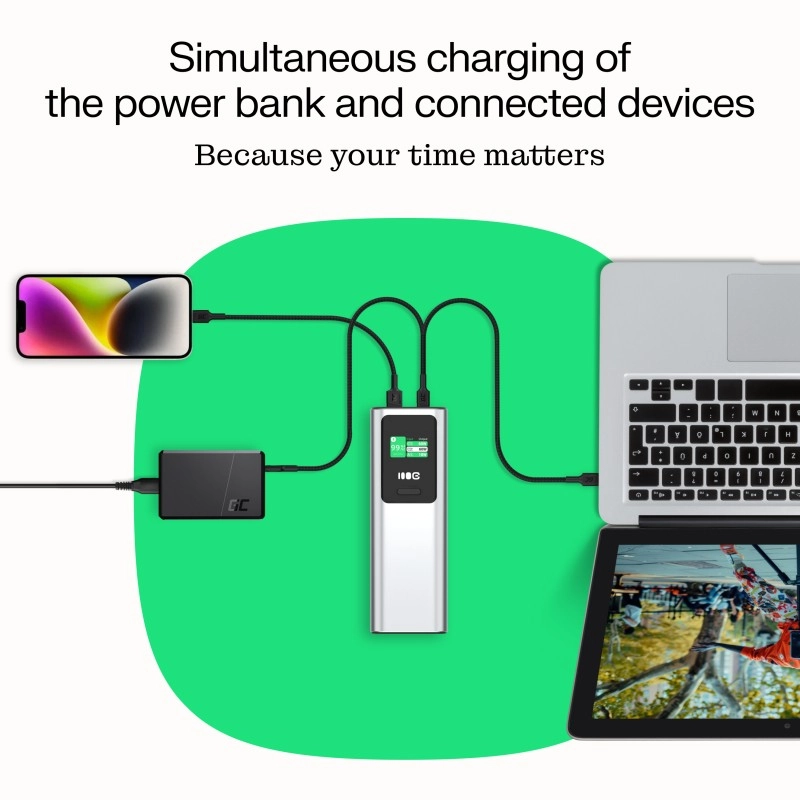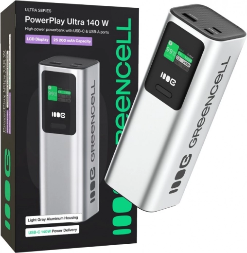 Hľadáte náhradu za zásuvku na cestách? Powerbanka GREEN CELL PowerPlay Ultra kombinuje obriu kapacitu 25200 mAh a ultrarýchle nabíjanie 140 W PD, takže zvládne súčasne napájať aj dva notebooky a viackrát dobiť váš smartfón či tablet. Vďaka USB‑C a USB‑A portom je kompatibilná so širokou škálou zariadení a pripravená na moderné štandardy nabíjania.